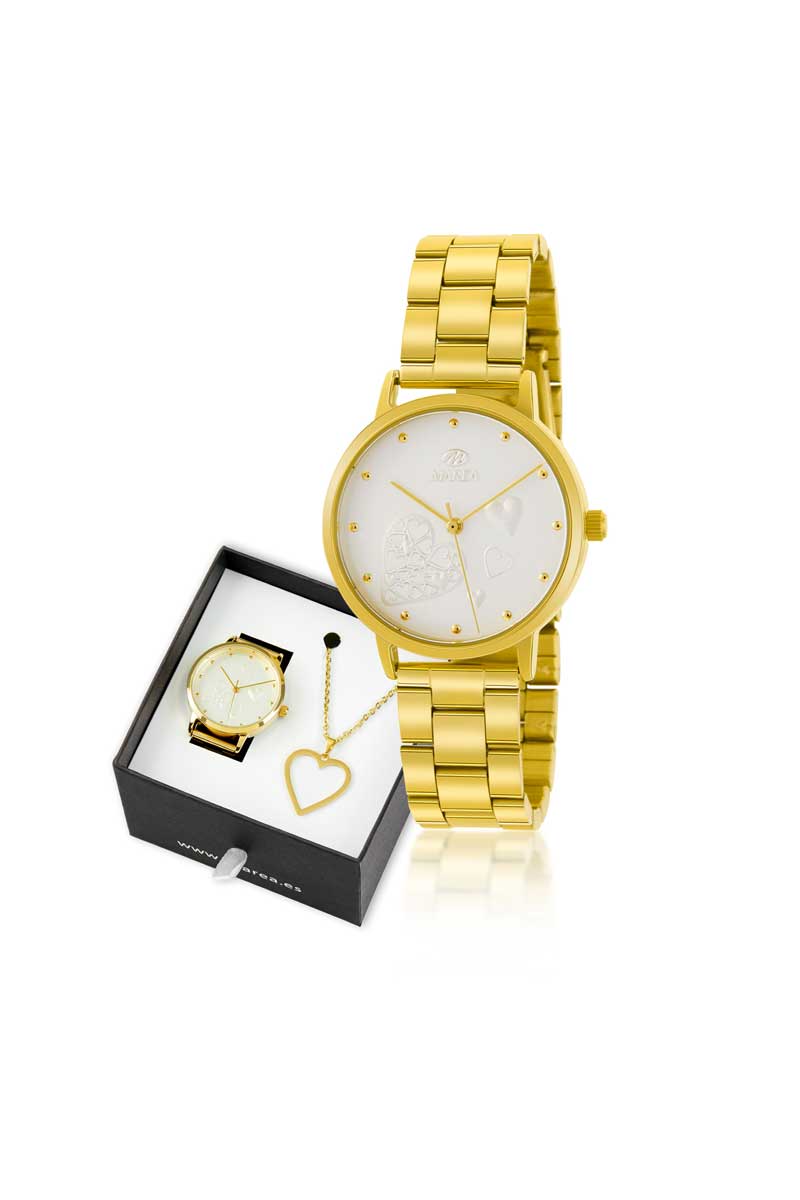 Reloj Marea de mujer y colgante de acero dorado en forma de corazón.