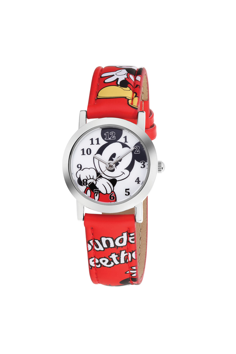 Reloj Mickey Mouse. Con caja de acero de 26mm y fondo de acero a presión. Esfera blanca con Mickey Mouse. La pulsera es de piel en color rojo con dibujos de Mickey. Impermeabilidad 3 ATM. Movimiento de cuarzo 3 agujas.